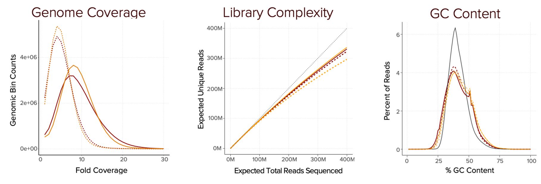 ForShear>SRSLY Whole Genome Sequencing Metrics. The mapping metrics of the libraries showed that both approaches generated good quality libraries for both input types with comparable chimeric rates, genome coverage and GC content. However, ForShear>SRSLY generated libraries with lower duplication rates and higher complexity even with the severely damaged input types.