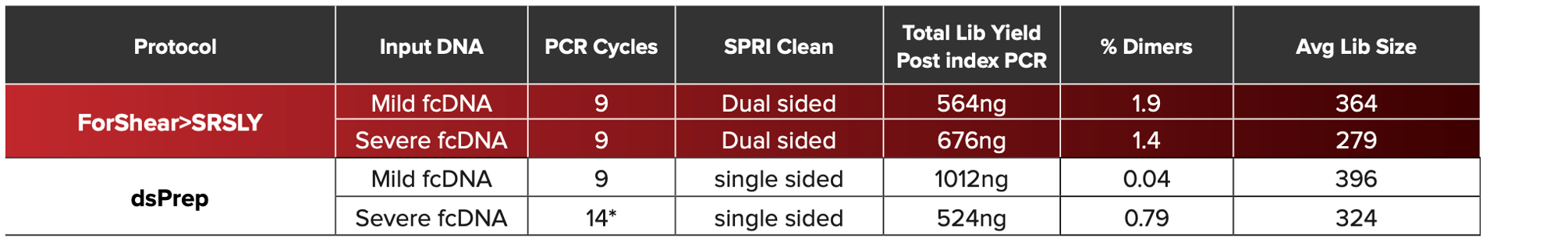 ForShear>SRSLY Molecular Metrics. Libraries were prepared with the Horizon Discovery formalin compromised DNA set - Mild fcDNA (DIN ~7) and Severe fcDNA (DIN ~3). For Mild fcDNA, both SRSLY>ForShear protocol and the dsPrep protocol showed equivalent molecular metrics. However, for the severe fcDNA, SRSLY>ForShear generated high-quality libraries at lower PCR cycles with minimal adapter dimers. Overall, the SRSLY approach generated smaller libraries presumably due to the capture of nicked and short ssDNA. Download the collateral for more information.