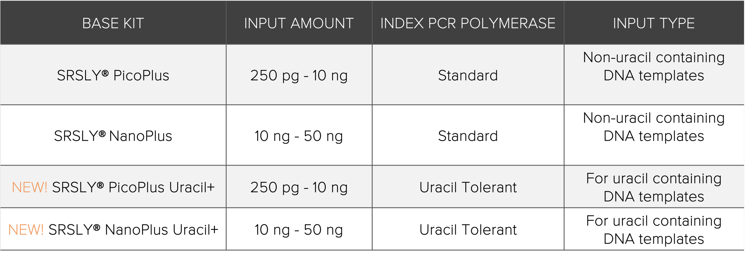 Customers now have the option to purchase either our standard index PCR polymerase or an uracil tolerant index PCR polymerase when purchasing a SRSLY base kits (Pico/Nano). Customers should consider purchasing the uracil tolerant index PCR polymerase containing base kit (Pico/Nano) when their template DNA contains uracils. Some example templates are as aDNA, some FFPE samples and methyl-converted DNA. Customers working with all other template DNA types should utilize the SRSLY kit containing the standard index PCR polymerase. Customers should purchase the SRSLY kit containing the standard index PCR polymerase when purchasing the UMI add-on kit regardless of template DNA type because the UMI extension polymerase is uracil tolerant. Therefore, there is no need for an uracil tolerant index PCR polymerase.